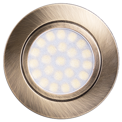 Mini LED downlight for building-in. The model is stationary, with satin brass body, 4W, designed to replace the halogen downlights with power up to 28W. This model has a color temperature of 4200K (neutral light). The downlight has a degree of protection IP44 (damp-proof), suitable for dusty and damp environment – bathrooms, porches, etc. The diffuser is specially made to reduce glaring. The luminance angle is 60⁰, excellent choice for accent lighting. The LED downlight could be combined with an LMLFSB frame for surface mounting.