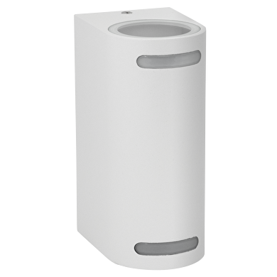 It is a façade lighting fixture, for wall mounting, with bidirectional illumination. It has powder-coated white aluminium housing. Diffuser from transparent tempered glass. Two GU10 sockets, intended for use with GU10 LED spotlights. It has all the required sealings to ensure a high protection from dust and moisture IP44. The fixture is distinct from the others on the market with its design – it has matted, decorative openings, where part of the light passes through. ATTENTION! The product is designed with draining lines in case of water penetration. The fixture has a direction of mounting, so that the drainages are in the lower part. The direction is indicated on the mounting base.